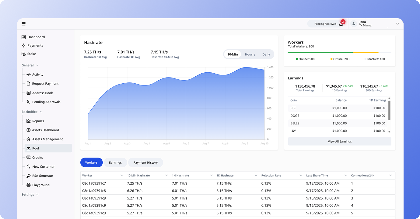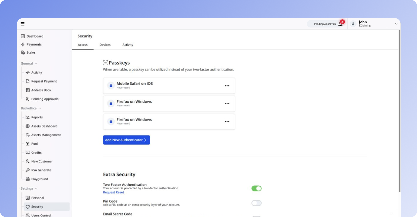 One platform for mining operations, stablecoin banking, MPC wallets, credits cards, and digital asset management that is secured with institutional controls and automated workflows.